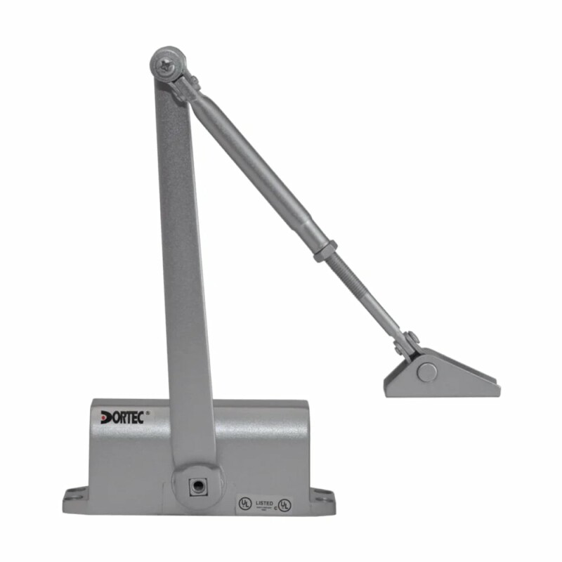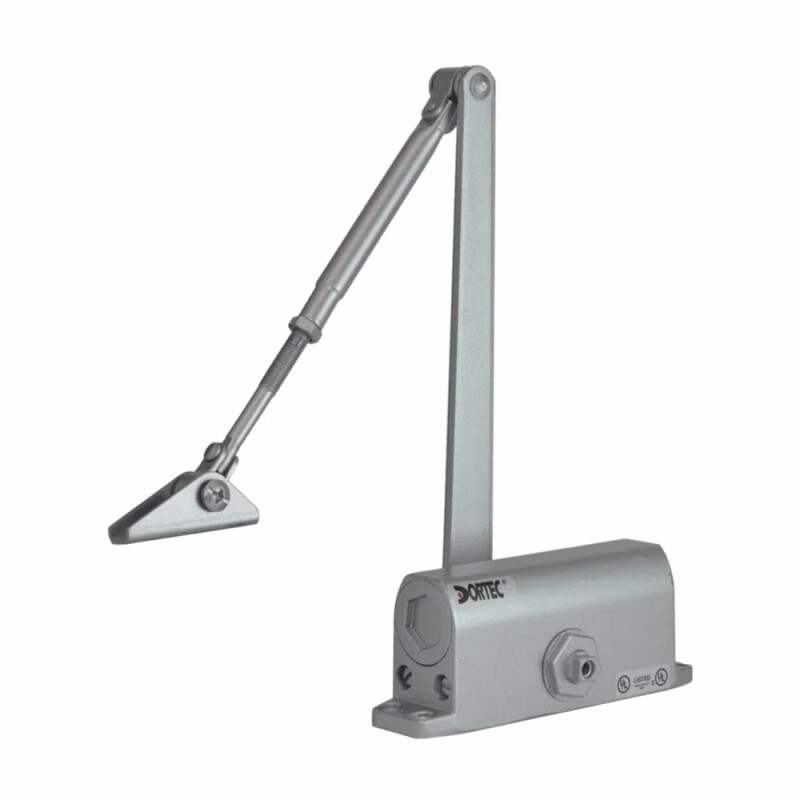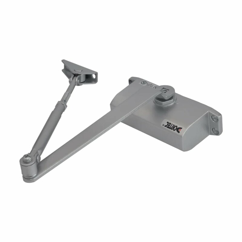 Дверний доводчик Dortec DT-62H Silver зі складаним важелем, з функцією утримання дверей у відчиненому положенні під кутом 85°. Маса дверного полотна 25-45 кг.