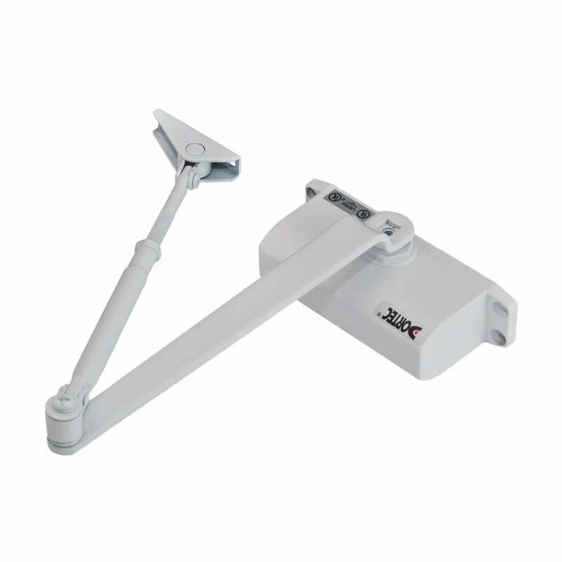 Дверний доводчик Dortec DT-62H White зі складаним важелем, з функцією утримання дверей у відчиненому положенні під кутом 85°. Маса дверного полотна 25-45 кг.