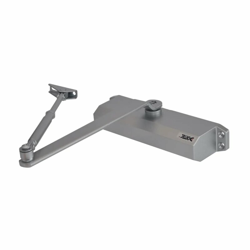 Дверний доводчик Dortec DT-65H Silver зі складаним важелем, з функцією утримання дверей у відчиненому положенні під кутом 85°. Маса дверного полотна 85-120 кг.