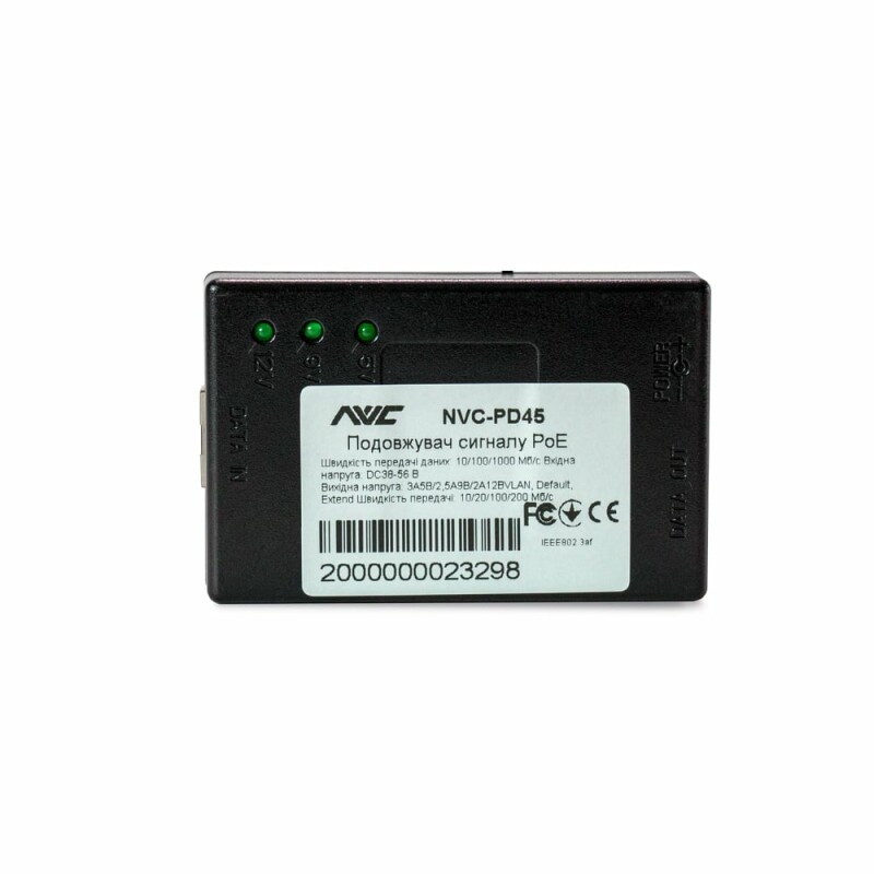 PoE-подовжувач-перетворювач 1-портовий NVC-PD45 стандарту 10/100M 802.3af/at. Порти: 1 PoE-вхід/1 LAN-вихід; 1 вихід живлення. На виході пристрою формується напруга живлення 12/9/5В – в залежності від перемикача.