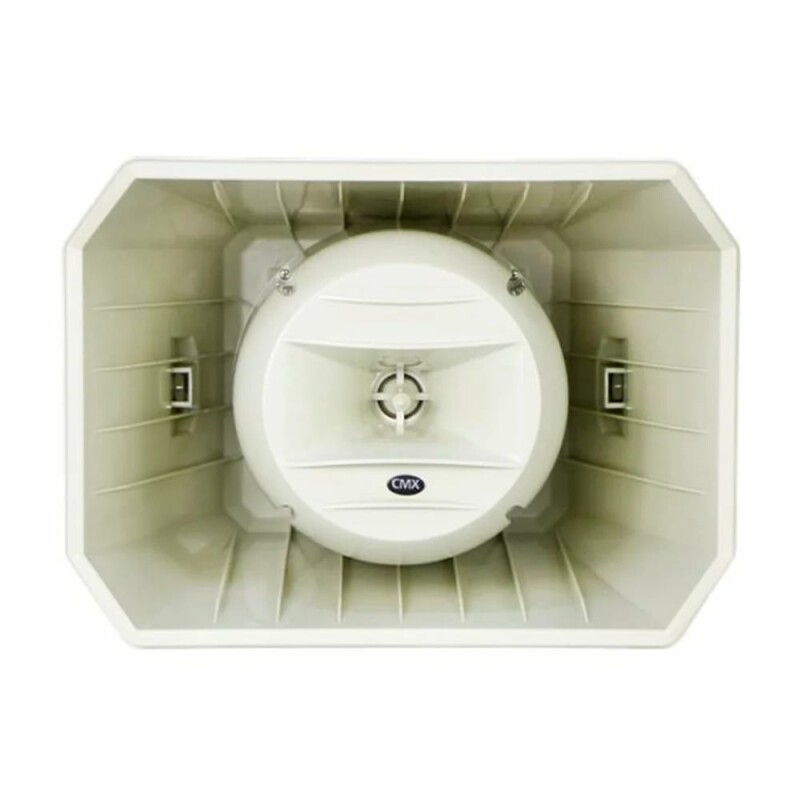 Вуличний рупорний гучномовець MHS-60EN CMX Номінальна вихідна потужність 12.5Вт / 25Вт / 50Вт, опір 8 Ом.Гучномовець сертифікований за стандартом EN54-24. Розподільча коробка з керамічним роз’ємом, вогнестійким кабелем 95 ℃ і термозапобіжником. Корпус з пластику ABS, кронштейн з алюмінію білого кольору (в комплекті). Простий та безпечний монтаж забезпечує металевий кронштейн.
