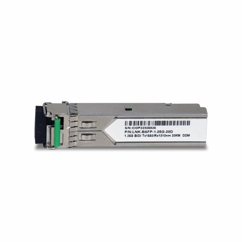 Компактний оптичний передавач LNK-BSFP-1.25G-20D LC 1550 нмTX (20 км) з довжиною хвилі 1550 нм, 1 роз'єм LC, тип випромінювача: FP, тип волокна: SМ, 9/125 μm, відстань передачі даних до 20 км, швидкість передачі 1.25 Гбіт/с.