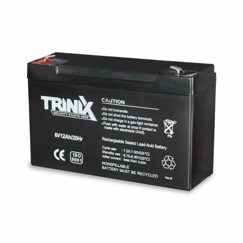 Акумуляторна батарея Trinix 6V12Ah/20Hr AGM ємністю 12 Аг, з вихідною напругою 6 В, тип – AGM свинцево-кислотна.