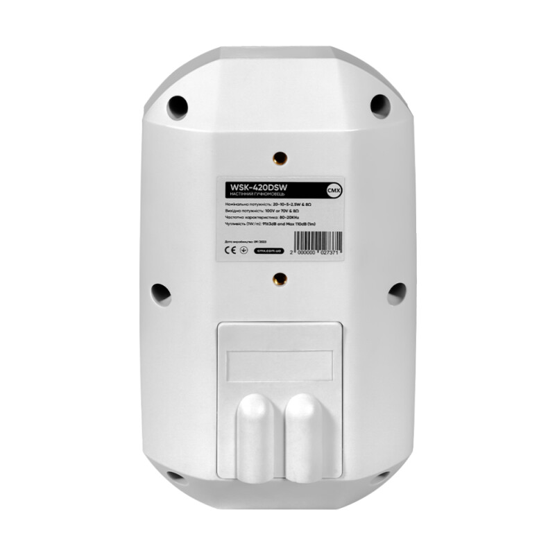 Вуличний настінний гучномовець CMX WSK-420DS двосмуговий. 4-дюймовий НЧ-динамік і 1-дюймовий ВЧ-динамік, вихідна потужність 2.5-5-10-20 Вт на 8 Ом. Лінійний вхід 100 або 70 В. Монтаж за допомогою кронштейна з комплекту.