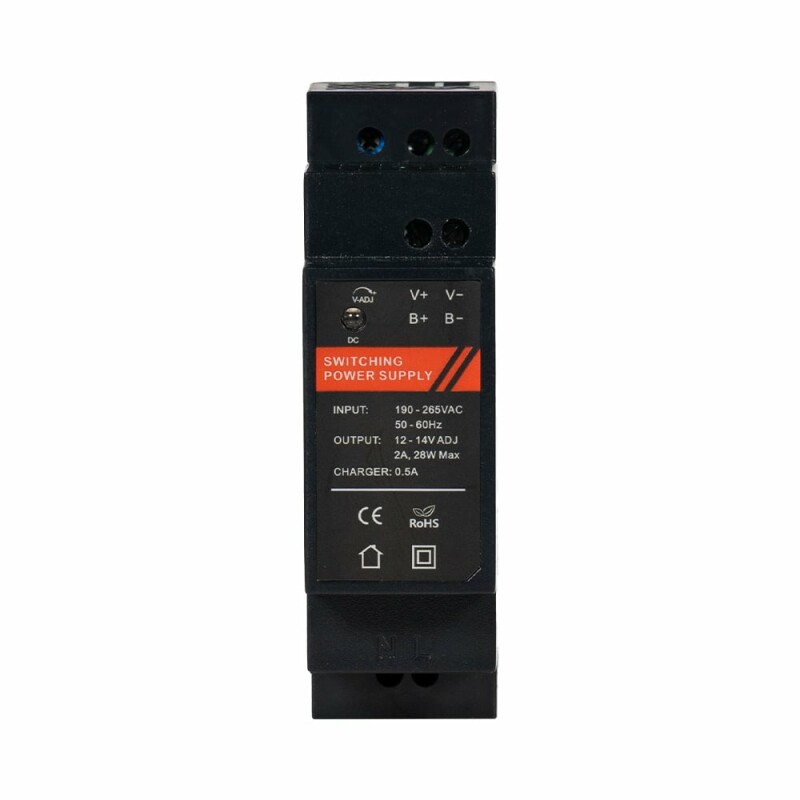 Блок безперебійного живлення імпульсний Kraft PSU-1202DIN(P) з LED-індикацією, з кріпленням на DIN-рейку, номінальні вихідна напруга/струм 12 В/2 А, номінальна вихідна потужність 28 Вт, вхідна напруга 190-265 В, максимальний струм заряду 500 мА.