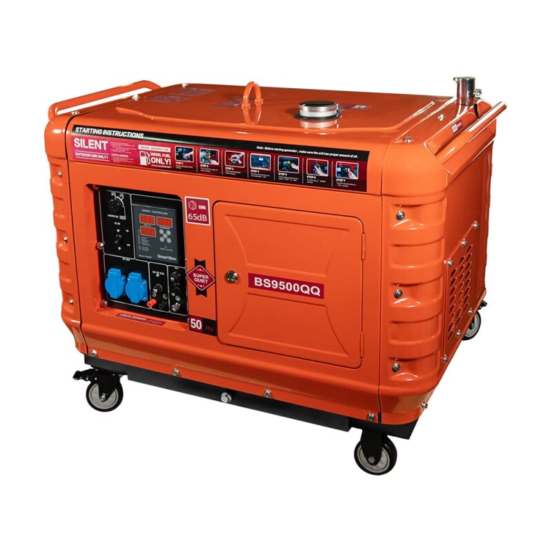 Генератор дизельний однофазний Bison BS9500QQ з номінальною потужністю 5.5 кВт / максимальною потужністю 6 кВт, вихідна напруга 220 В, 2 розетки 220 В. Тип запуску: електричний. Роз’єм для підключення автоматичного введення резерву (ATS). Одноциліндровий, вертикальний, чотиритактний двигун з повітряним охолодженням, об'ємом 499 см.куб. Об'єм паливного бака 14.5 л. Витрати палива 2.2 л/год.
