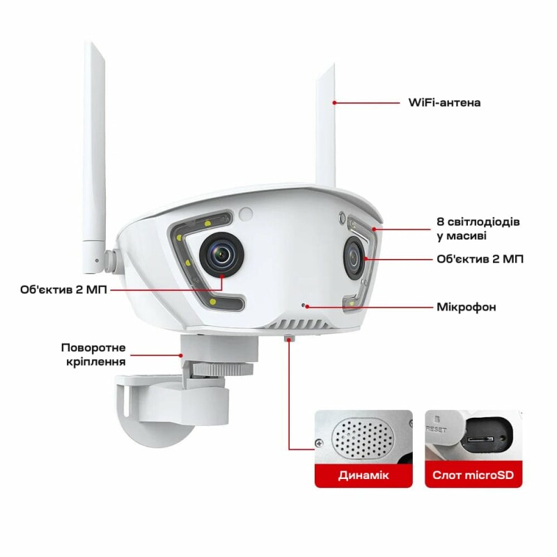 • Три режими нічного бачення: ІЧ на відстані до 30 м, кольорове LED на відстані до 20 м та «розумне» підсвічування.