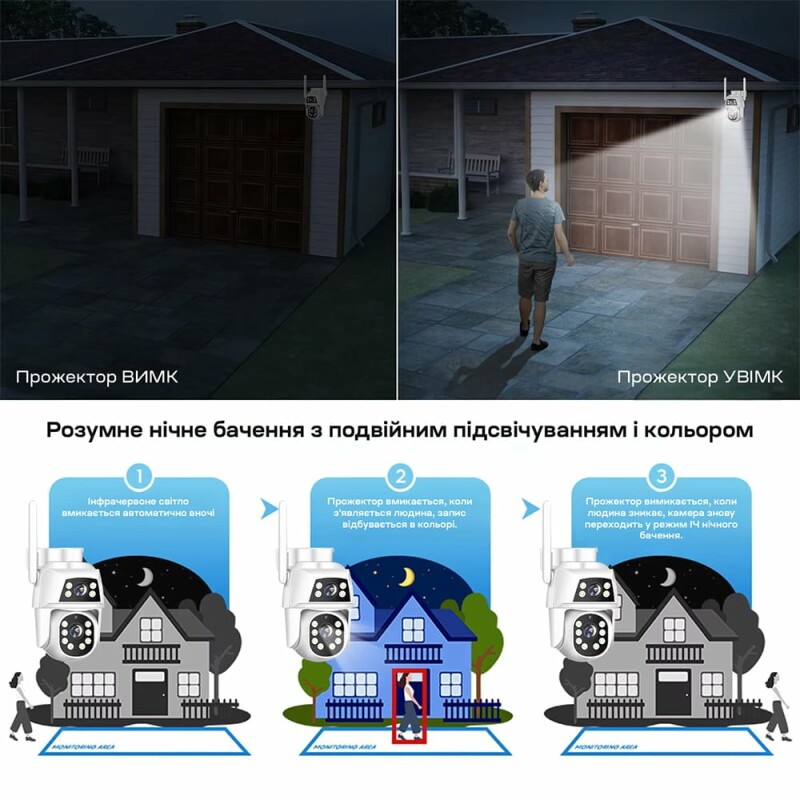 - Три режими нічного бачення: подвійне, інфрачервоне та повноколірне LED, дальність до 30 м.
