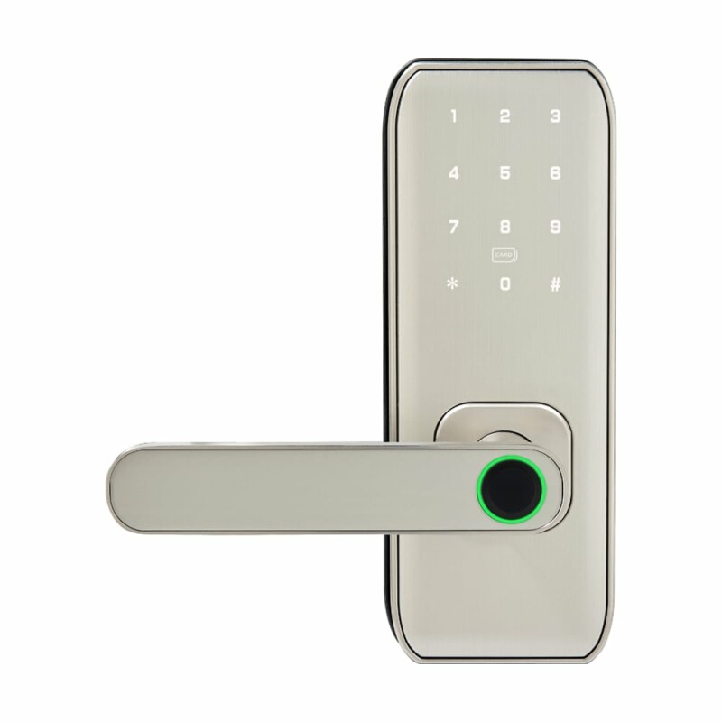 Trinix TRL-5406BTF Silver L/R – біометричний автономний електрозамок з підтримкою Bluetooth, з доступом за відбитком пальця, кодом, карткою Mifare, ключем, через застосунок TTLock. Встановлення на лівобічні / правобічні двері.