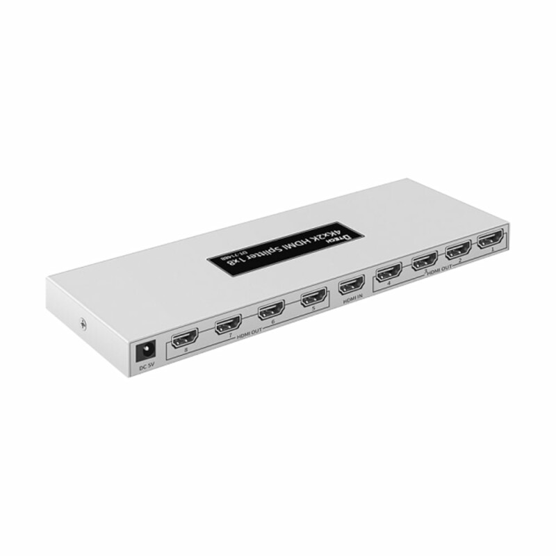 Розгалужувач відеосигналу 4K HDMI 1x8 Dtech DT-7148B(MS) дозволяє дублювати один вхідний сигнал HDMI на вісім виходів одночасно. Підтримка роздільної здатності до 4K. У разі підключення стандартним кабелем HDMI 26AWG забезпечує стабільну передачу сигналу без втрати якості на відстань до 5 метрів на вході та до 10 метрів на кожному з виходів.
