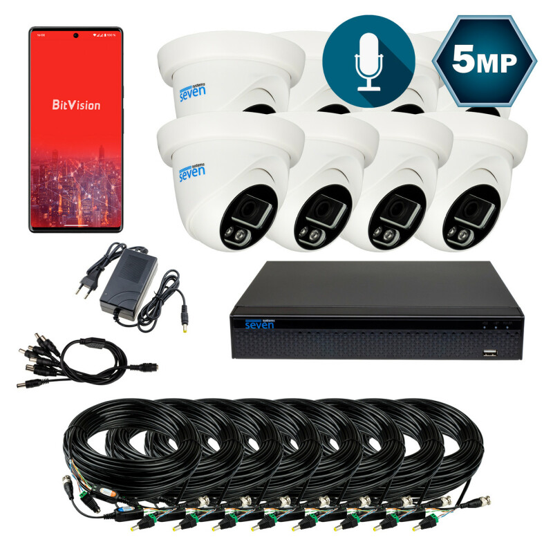 Серцем комплекту відеоспостереження є відеореєстратор SEVEN MR-7608, який дозволяє підключати до себе 8 мультиформатні камери + 4 IP-камери до 5 Мп, які можна придбати окремо. В режимі "Тільки IP" відеореєстратор підтримує 16 IP-відеокамер до 8 Мп.