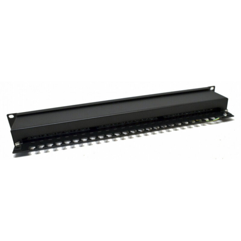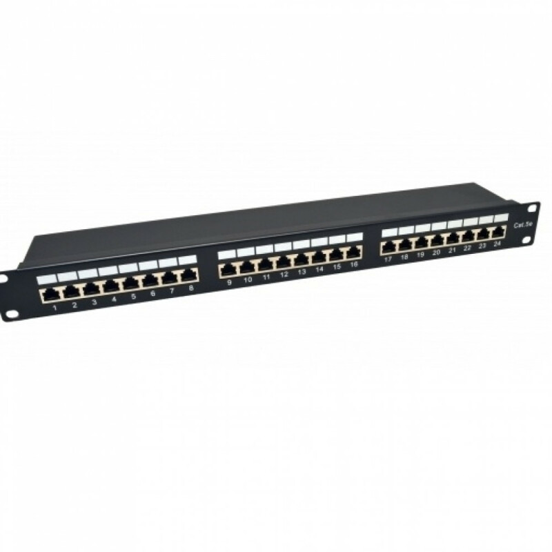 • На лицьовій стороні патч-панелі розташовані 24 екранованних порти з роз'ємами RJ-45 для підключення патч-кордів. Нанесено цифрове маркування з додатковим місцем для підпису портів