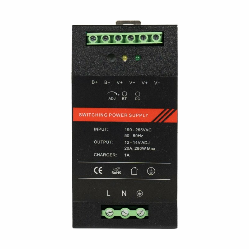 Блок безперебійного живлення імпульсний Kraft PSU-1220DIN з LED-індикацією, з кріпленням на DIN-рейку, 2 канали навантаження, номінальні вихідна напруга/струм 12 В/20 А, номінальна вихідна потужність 280 Вт, вхідна напруга 190-265 В, максимальний струм заряду 1 А.