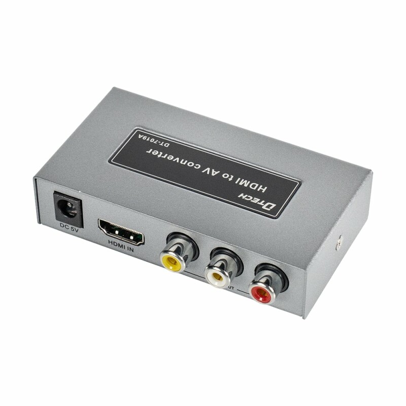 Конвертер відеосигналу HDMI-AV Dtech DT-7019A – перетворювач для конвертації високоякісного HDMI-сигналу на композитний відеосигнал AV (CVBS) та стереоаудіосигнал FL/FR. Цей пристрій дозволяє перетворити відеосигнал високої чіткості з HDMI-джерела на стандартний CVBS-сигнал, що підтримує формати PAL та NTSC.