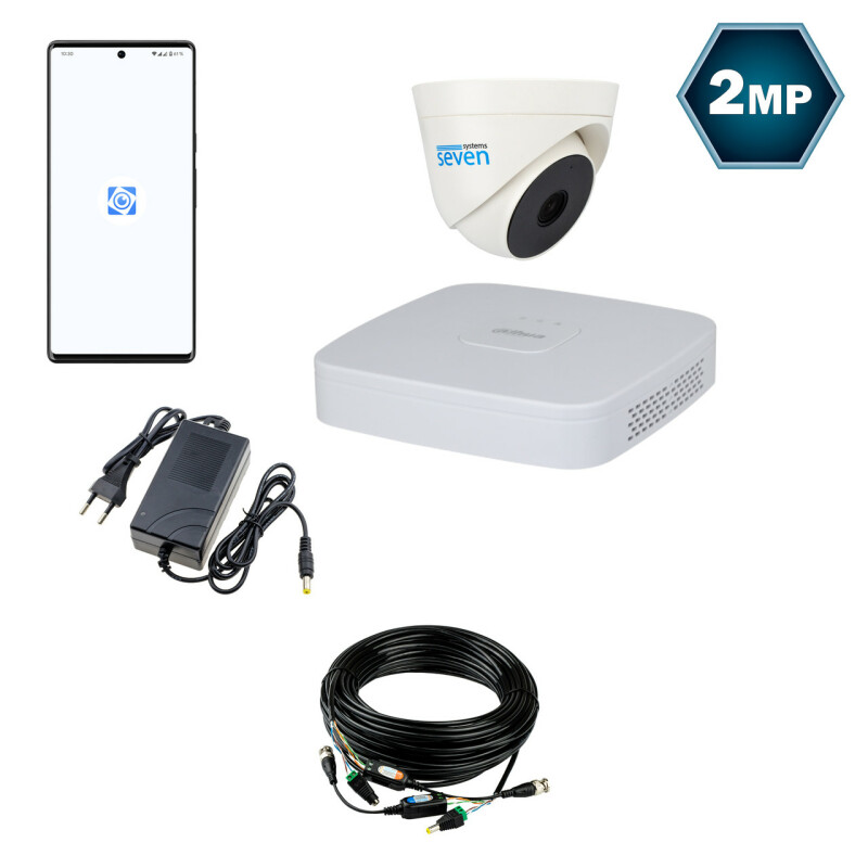 Для під'єднання камер SEVEN до відеореєстратора Dahua в комплекті передбачено кабель кручена пара з розрахунку 20 м на кожну камеру та комплекти роз'ємів живлення і спеціальних прийомопередавачів. Для зручності користувач може самостійно визначати довжину кожного кабелю для під'єднання відеокамери з огляду на особливості його об'єкта. На кабелі з боку відеокамери монтується прийомопередавач і роз'єм живлення "тато", а з боку відеореєстратора - прийомопередавач і роз'єм живлення "мама". За допомогою такого кабелю до відеокамери під'єднують BNC роз'єм прийомопередавача для передавання відео та конектор живлення "тато" для подачі на камеру живлення 12В. Другий кінець кабелю під'єднується роз'ємом BNC до відеореєстратора і роз'ємом живлення "мама" до блоку живлення. Досить просто під'єднати камеру до живлення і відеореєстратора, після чого він визначить камеру і покаже з неї зображення.
