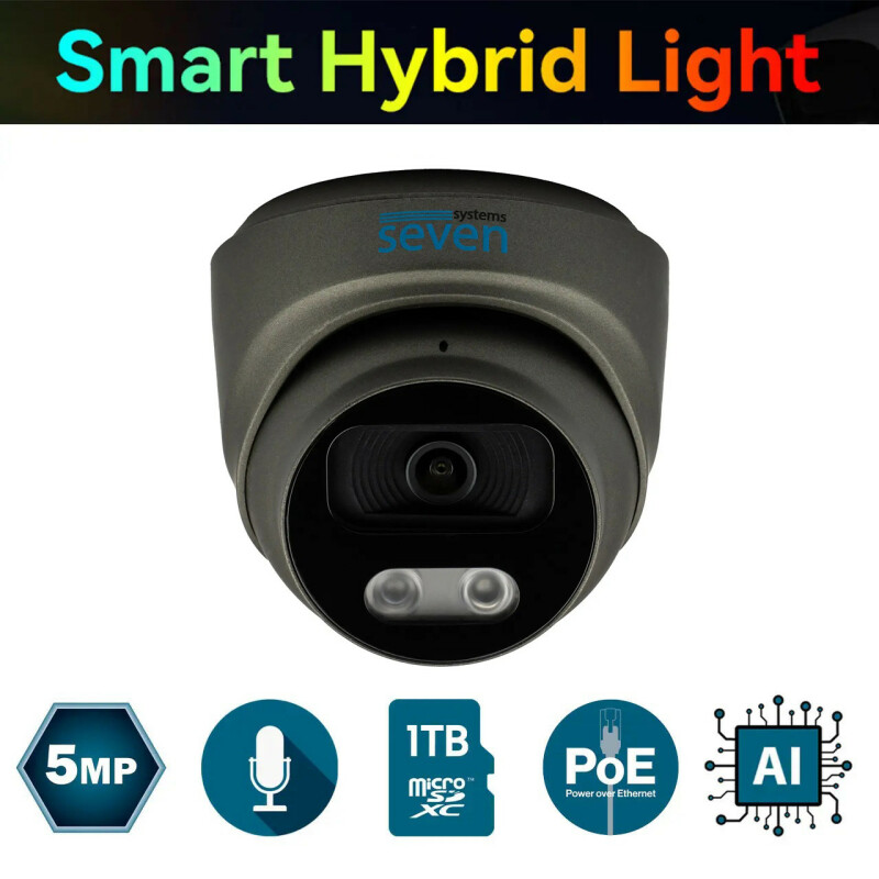 SEVEN IP-7215PA-DL black— купольна 5-мегапіксельна IP-відеокамера з вбудованим мікрофоном, слотом для карт пам’яті MicroSD об’ємом до 1 ТБ та інтелектуальним подвійним підсвічуванням для нічного бачення. Камера призначена для встановлення як у приміщеннях, так і на вулиці.