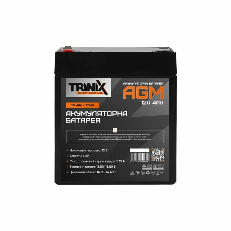 Акумуляторна батарея Trinix 12V4Ah/20Hr AGM ємністю 4 Аг, з вихідною напругою 12 В, тип – AGM свинцево-кислотна.