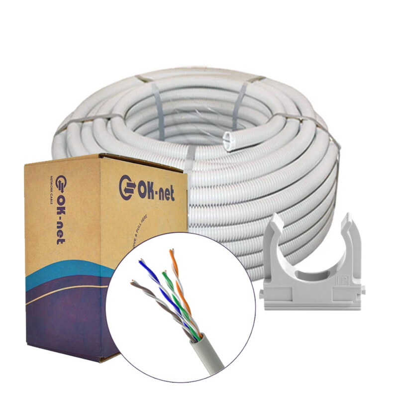 Звита пара OK-Net КПВ-ВП (350) UTP кат.5е, 4х2х0.51 бухта 305м (UTP мідь внутрішній) Гофротруба Light ДКС ПВХ D 25 (50 м) сіра Кліпса для гофри 25 мм (50 шт/уп) сіраХарактеристики кабелю: