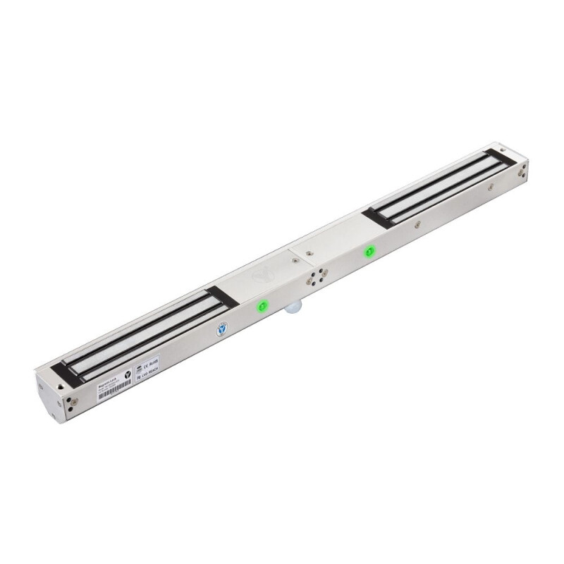 YM-280ISD(LED) – накладний електромагнітний замок для двостулкових дверей з ІЧ-датчиком руху, світловою індикацією, таймером затримки на 0,3,6,9 сек та датчиком стану замка, із силою утримання до 280*2 кг на відрив. Є сухі контакти для визначення стану замка (NO,NC,COM).