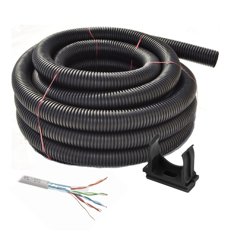 Camsecurity - магазин сучасних технологій комфорту та безпеки / Товари / Комплект: Кабель OK-Net КПВЭ-ОП (200) FTP кат.5е (FTP медь внутренний) бухта 305м + Гофротруба стандартная ДКС ПВД D 32 (25 м) черная + Клипса для гофры 32 мм (50 шт/уп) черная