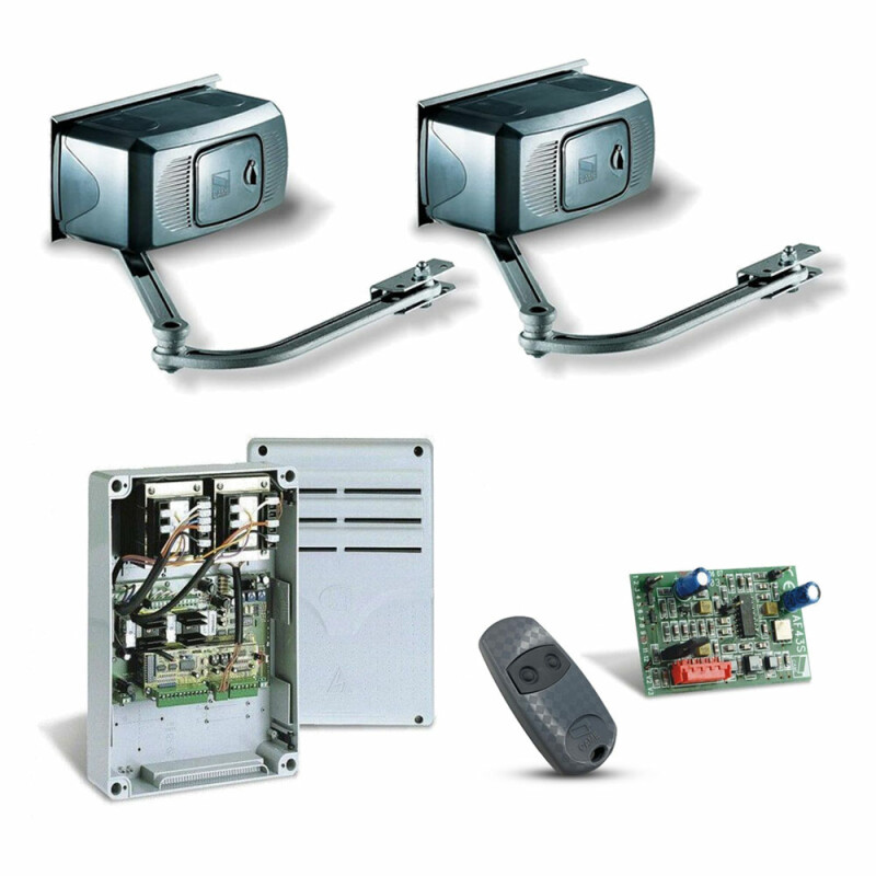 Комплект автоматики для розпашних воріт шириною до 4 м і вагою до 800 кг ATS 3000 з можливістю встановлення на широкі стовпи. До складу комплекту входять: 2 приводи, що самі блокуються, з кінцевими вимикачами, F1000, панель керування у коробі ZA3P, одноканальний радіоприймач AF43S, двоканальний пульт дистанційного керування TOPD2R.