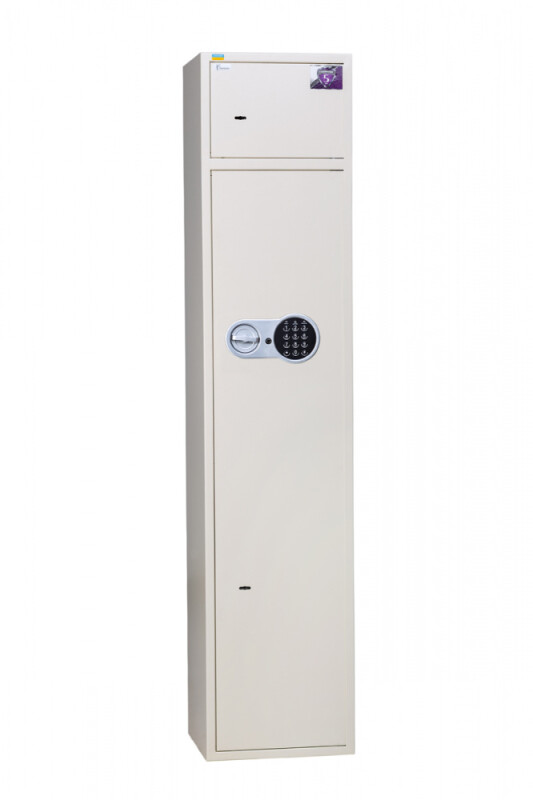 Зовні сейф виглядає дуже просто і скромно. Цікавим рішенням даної моделі є зовнішній трейзер. Таким чином, трейзер не займає внутрішній простір самого сейфа і закривається на окремий механічний замок. Основні двері збройового сейфа Е-148К2.Е1.1013 зачиняються на два замки, перший - електронний, другий - ключовий. Усередині розташовані 4 з'ємні ложементи для зберігання вогнепальної зброї. У сейфі, також знаходиться секція полиць, яка виймається з сейфа в разі непотрібності. На дверях розташовані 3 ложемента для зберігання документів, ключів, патронів або інших дрібних предметів. Також на дверях є блок з 3 гачками, на який можна вішати рюкзаки, сумки, кобуру і тощо збройний сейф Е-148К2.Е1.1013 пофарбовано порошково-полімерною фарбою, яка утворює захисний шар і збільшує термін експлуатації. Бежевий колір надає сейфу елегантності і підходить до будь-якого інтер'єру.