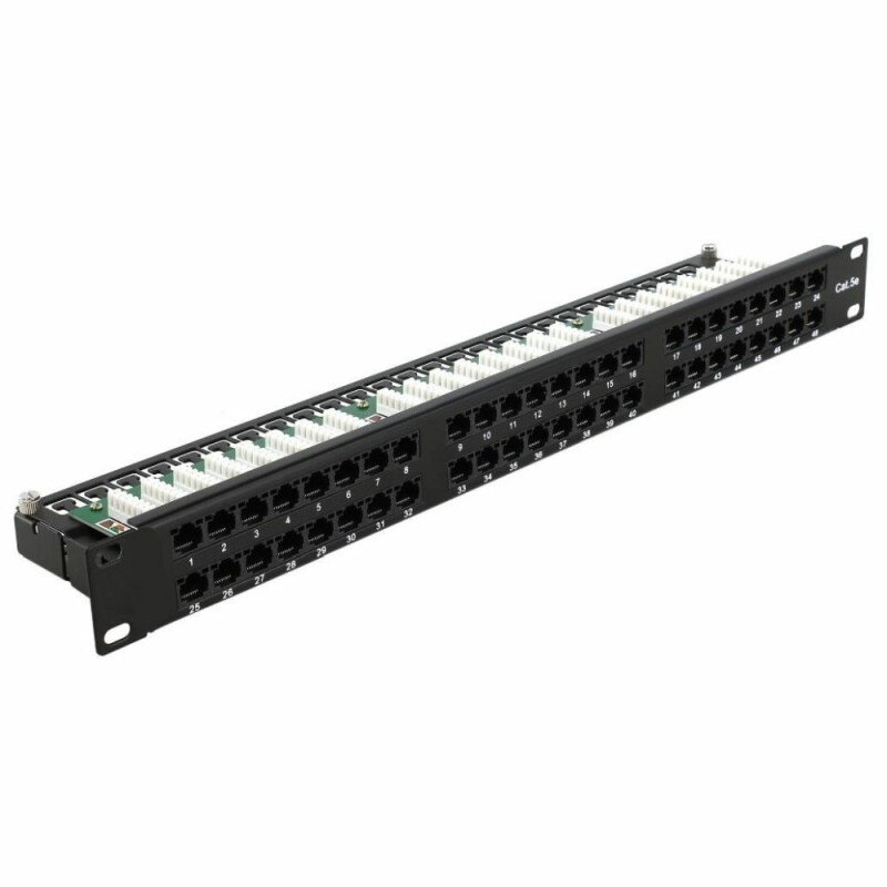 Патч-панель 48 портів UTP кат.5е 19" PP-KUTP48-1U з утримувачем кабелю - ідеальне рішення в умовах високої щільності розміщення обладнання в 19" конструкціях. Вбудований менеджмент ззаду патч-панелі 48 портів дозволяє надійно фіксувати та організовувати провідники, що значно покращує експлуатаційні характеристики і надійність з'єднань.