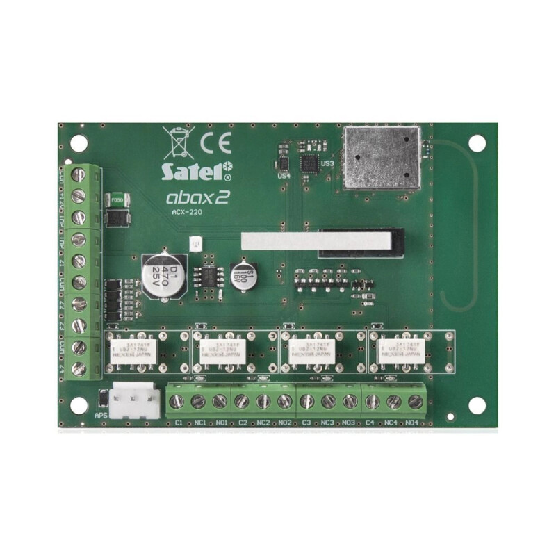 Модуль ACX-220 дозволяє використовувати дротові пристрої (сповіщувачі, оповіщувачі тощо) в бездротовій системі ABAX 2 / ABAX. Він має 4 програмовані зони для підтримки дротових сповіщувачів (NO і NC), також підтримуються шлейфи EOL і 2 EOL. Крім того, модуль має 4 програмованих дротових релейних виходи.