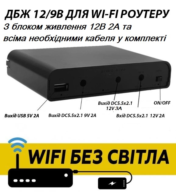 Як підключити PowerBank до роутера:Підключіть рідний блок живлення (наприклад, 12V 2.5A) до входу PowerBank. Вихідний кабель — до вашого Wi-Fi пристрою. Увімкнули — й забули: усе працює автоматично.