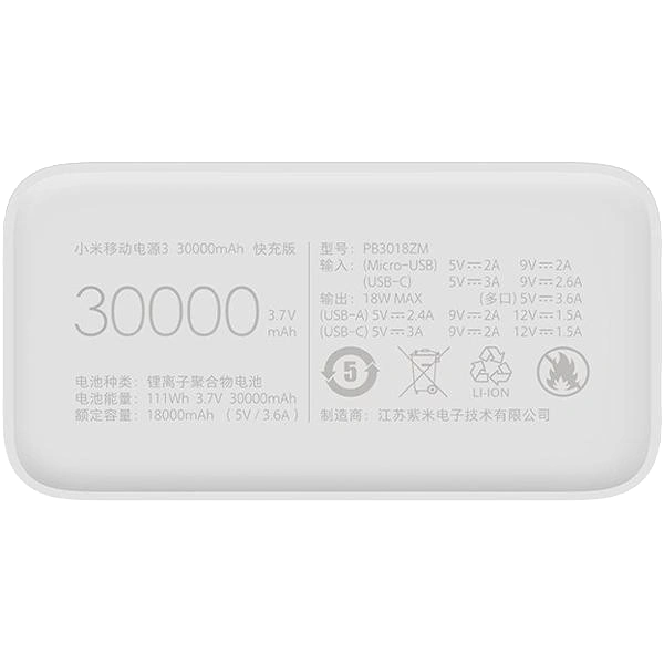 Повербанк Xiaomi Mi Power Bank 3 30000 mAh 24W Fast Charge PB3018ZM White (VXN4307CN)