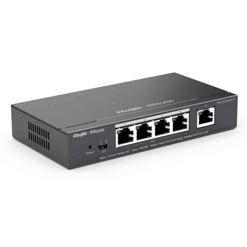 Ruijie RG-ES205GC-P — це 5-портовий гігабітний інтелектуальний POE комутатор, який призначений для використання в невеликих мережах офісів, квартир і домашніх мереж. Він підтримує до п'яти пристроїв, забезпечуючи високошвидкісний доступ до Інтернету та передачу даних. Комутатор має п'ять портів 10/100/1000 Мбіт/с і підтримує технологію Power over Ethernet (PoE). Це дає змогу передавати електроживлення на під'єднані пристрої, як-от камери відеоспостереження, точки доступу Wi-Fi та інші пристрої, які підтримують PoE, без необхідності використання окремого джерела живлення.
