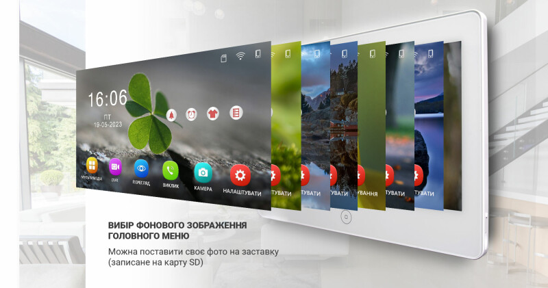 У домофоні ALPHA IPW просте та зрозуміле меню, де можна змінювати зображення для робочого столу або завантажити своє за допомогою microSD картки.