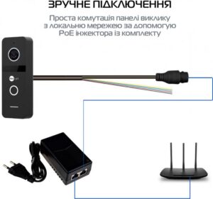 Для зручного підключення панелі виклику у мережу з одночасним поданням на неї живлення у комплекті знаходиться РоЕ інжектор. З’єднайте LAN кабелем панель виклику до домашнього роутера за допомогою РоЕ інжектора, а монітор можна з’єднати з роутером за допомогою WiFi - тепер лишилось додати панель до монітору одним кліком. Усе, ваша IP домофонна система готово до використання!