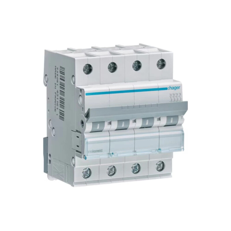 Автоматичний вимикач Hager MCN463 4P 6 кА C-63A 4M встановлюється в електричних щитах на стандартну напрямну DIN-рейку і може використовуватися як для побутових, так і для промислових цілей. Він швидко реагує на перевантаження і короткі замикання, автоматично вимикаючи електричний ланцюг для запобігання загоряння і пошкодження обладнання. Він також може працювати як вимикач для ланцюгів навантаження.