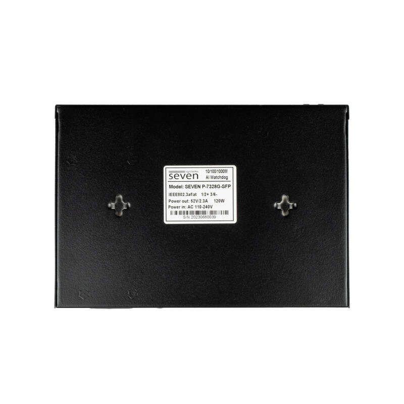 SEVEN P-7328G-SFP – компактний PoE-комутатор з підтримкою WatchDog AI, розроблений для IP-камер та іншого обладнання, яке потребує живлення через мережевий кабель. Він поєднує простоту монтажу, надійність і розширені функції, такі як автоматичний перезапуск камер, режим Extend для великих відстаней та підключення через оптику.
