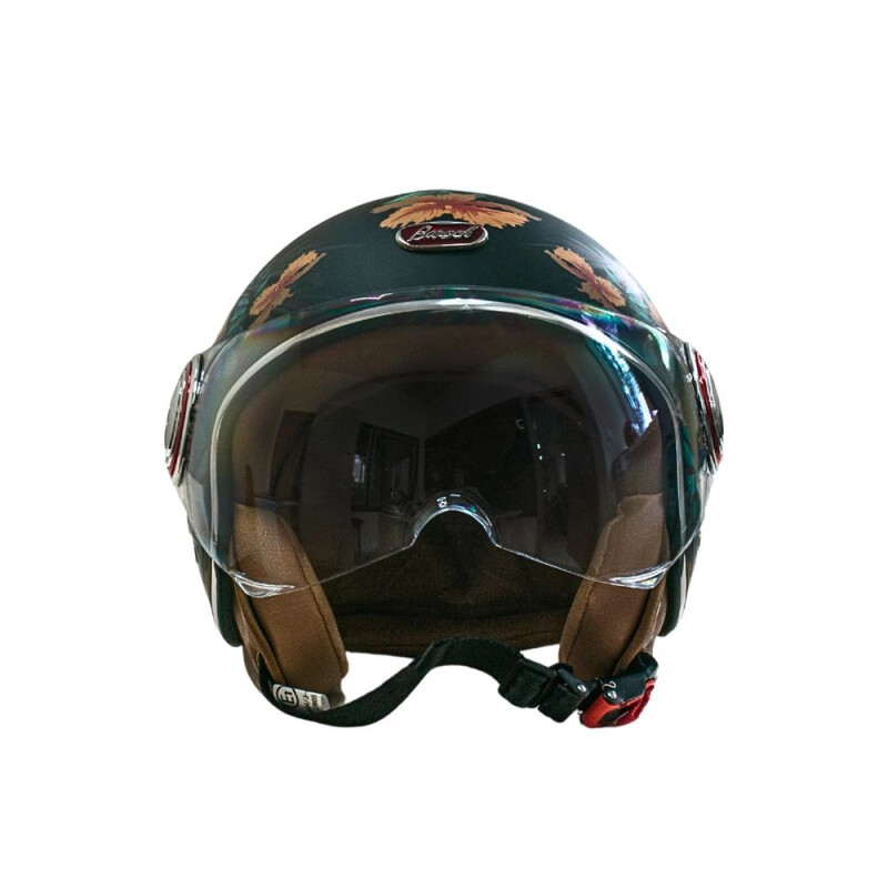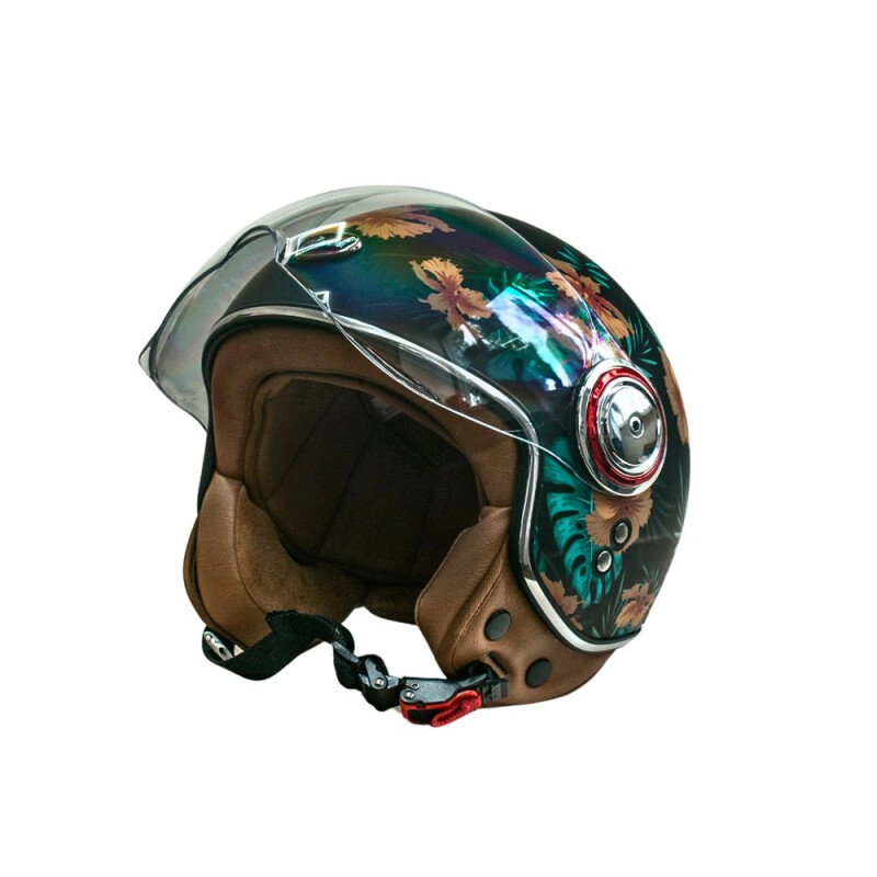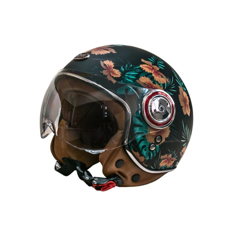 Відкритий класичний мотошолом 3/4 у ретро стилі виконаний із міцного ABS пластику, відрізняється малою вагою та гарною шумоізоляцією. Прозорий візор у закритому положенні захищає очі від вітру, дощу, піску та пилу. Ударопоглинаюча капсула шолома зроблена зі спіненого полістиролу EPS. М'яка знімна внутрішня підкладка виконана з гіпоалергенних матеріалів (штучна шкіра, сітка, велюр), допускає прання при 30 градусах.
