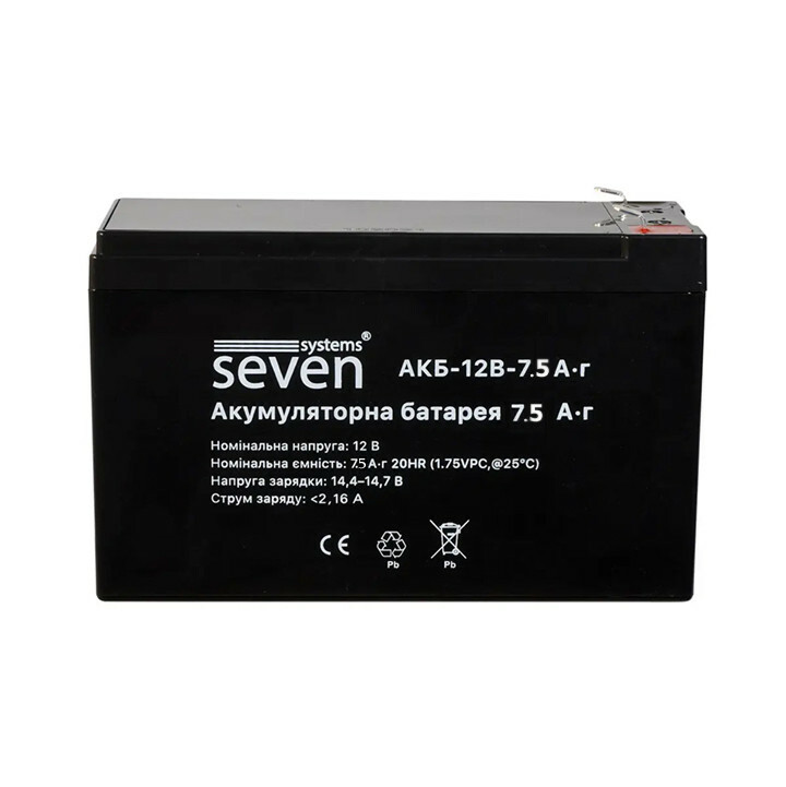 Акумуляторна батарея SEVEN 12В/7,5Ач підходить для живлення роутерів, сигналізацій, контролю доступу, відеоспостереження та відеодомофонів.