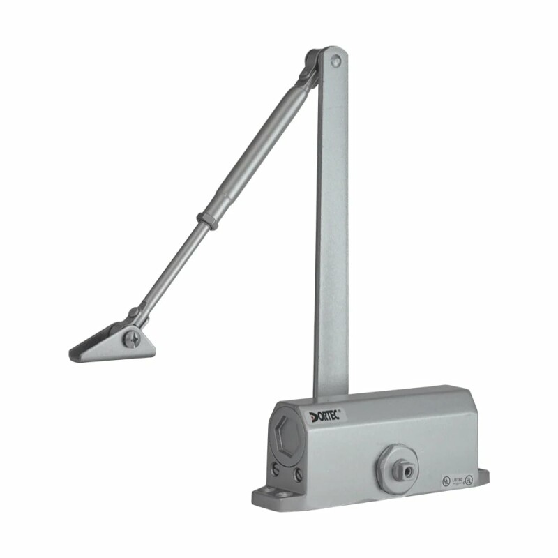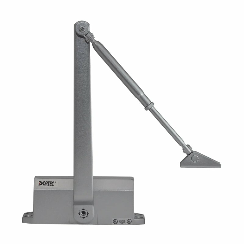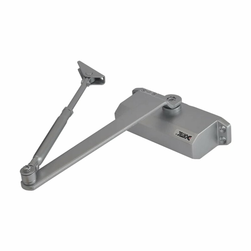 Дверний доводчик Dortec DT-63H Silver зі складаним важелем, з функцією утримання дверей у відчиненому положенні під кутом 85°. Маса дверного полотна 45-65 кг.