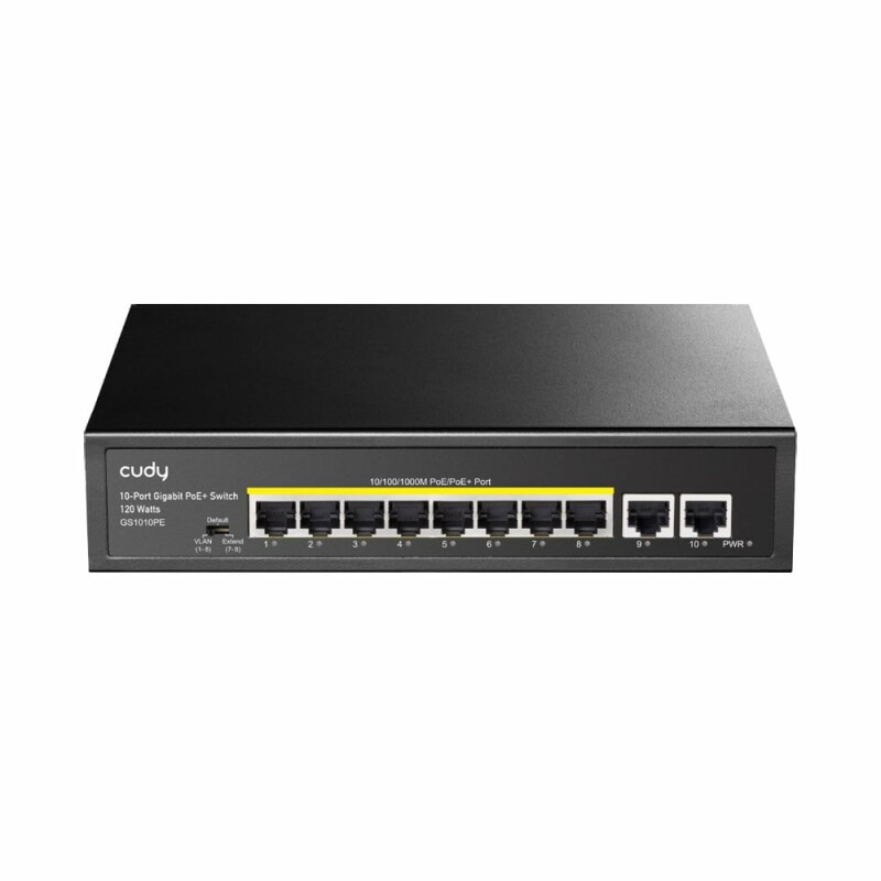 Некерований гігабітний PoE-комутатор Cudy GS1010PE оснащений 8 портами PoE+ 10/100/1000M, 2 портами Uplink 1000M. Стандарт живлення PoE IEEE802.3af/at. Загальна потужність 120 Вт, 30 Вт на 1 канал. Відстань PoE до 100 м.