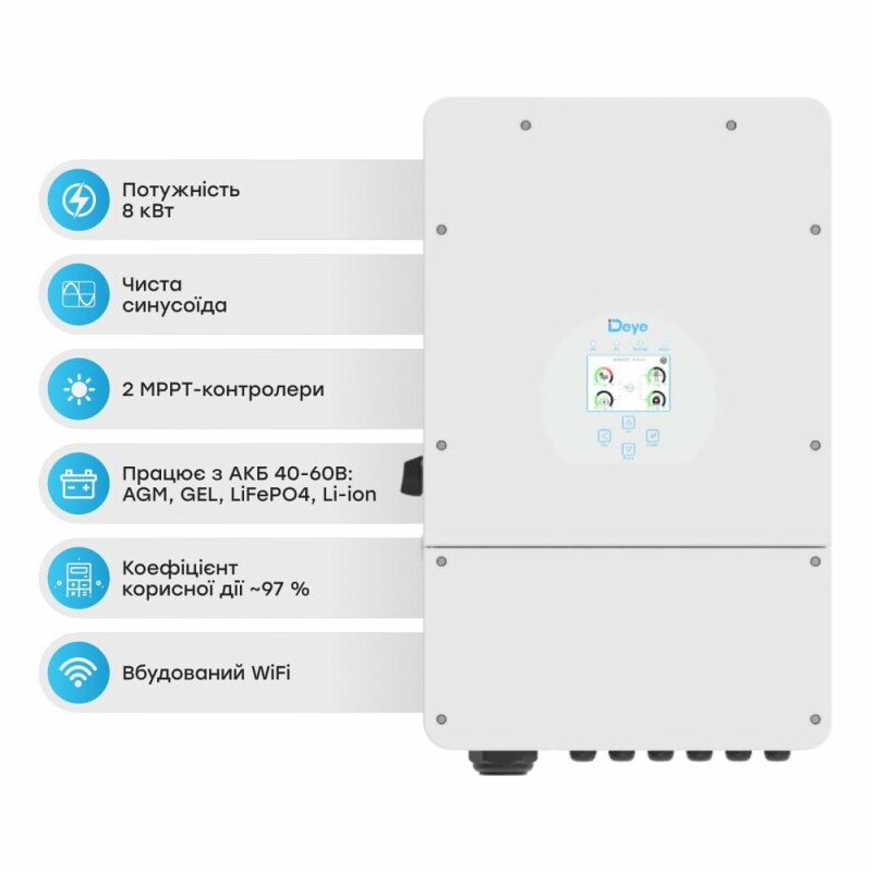 Гібридний однофазний інвертор Deye SUN-8K-SG01LP1-EU 8kW, 1Ф, 48V з номінальною потужністю 8 кВт (максимальна короткочасна потужність 8.8 кВт), з 2 вбудованими MPPT-контролерами та з вбудованим зарядним пристроєм. Може підключатися до акумуляторних блоків системи накопичення енергії. Діапазон напруги від сонячних панелей 125-500 В. Напруга акумуляторної батареї 40-60 В, підтримка заряду акумуляторних батарей типу AGM/GEL/LiFePO4/Li-ion, максимальний струм заряду 190 А / розряду 190 А. Вихідна напруга 230 В, ККД більше 97 %.