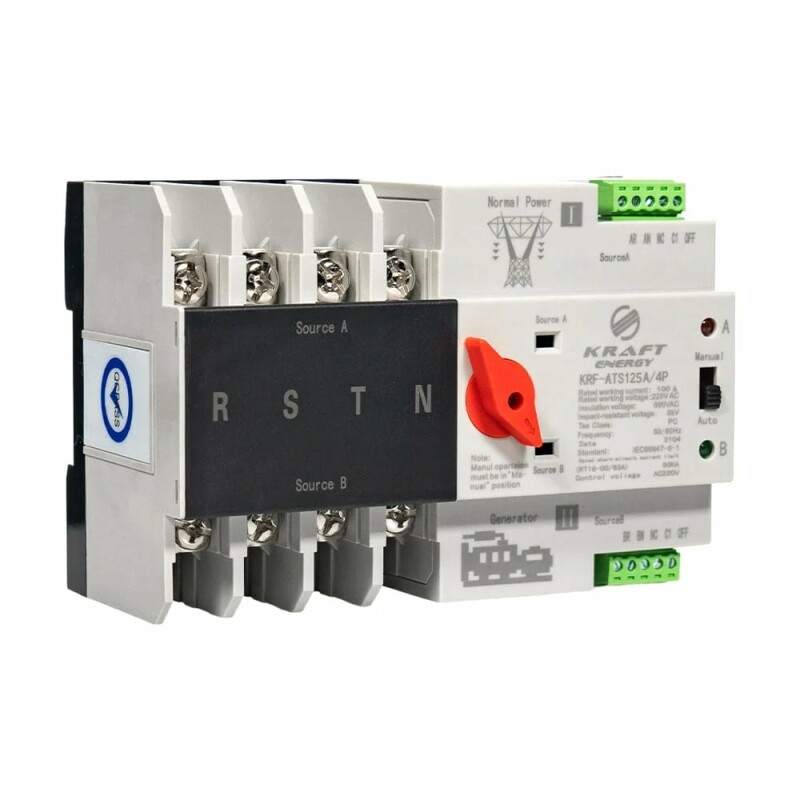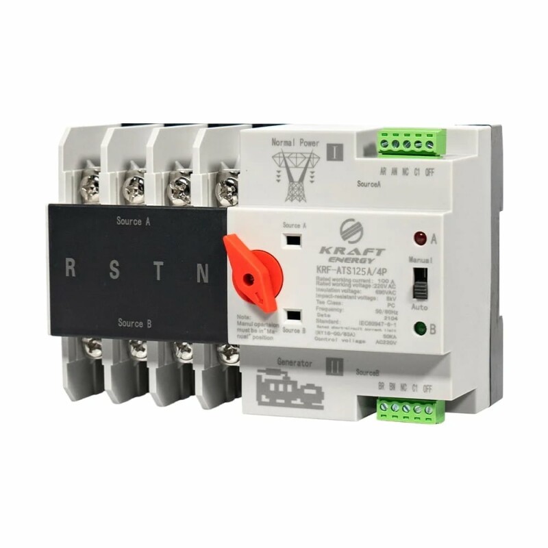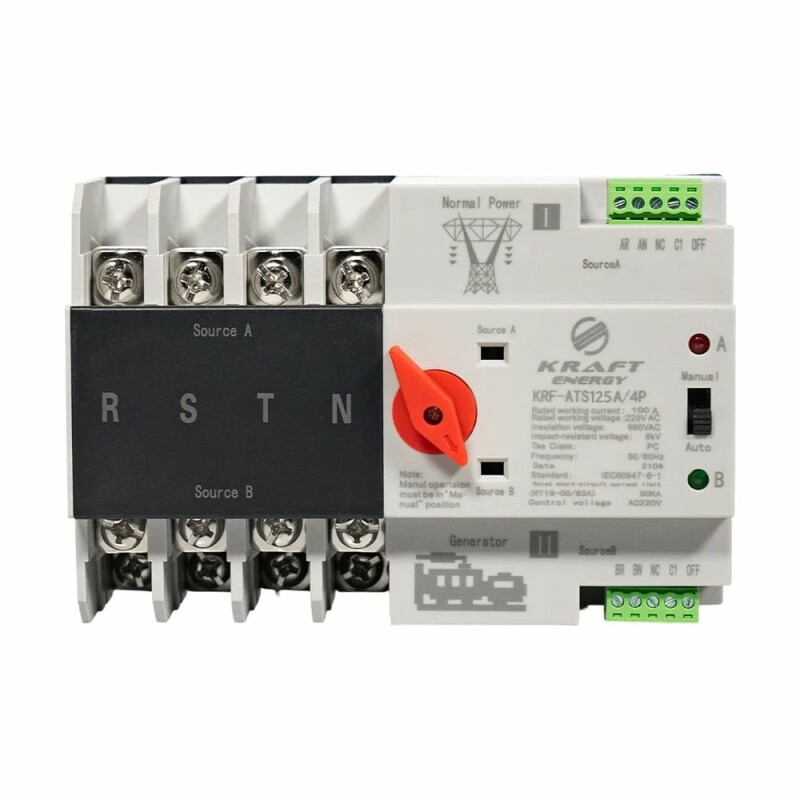 Автоматичний перемикач подвійного живлення Kraft KRF-ATS125A/4p для автоматичного (або ручного) перемикання між двома джерелами живлення. Номінальний струм 125 А, номінальна напруга AC 400 В/50 Гц, напруга ізоляції AC 690 В/50 Гц, кількість полюсів 4.
