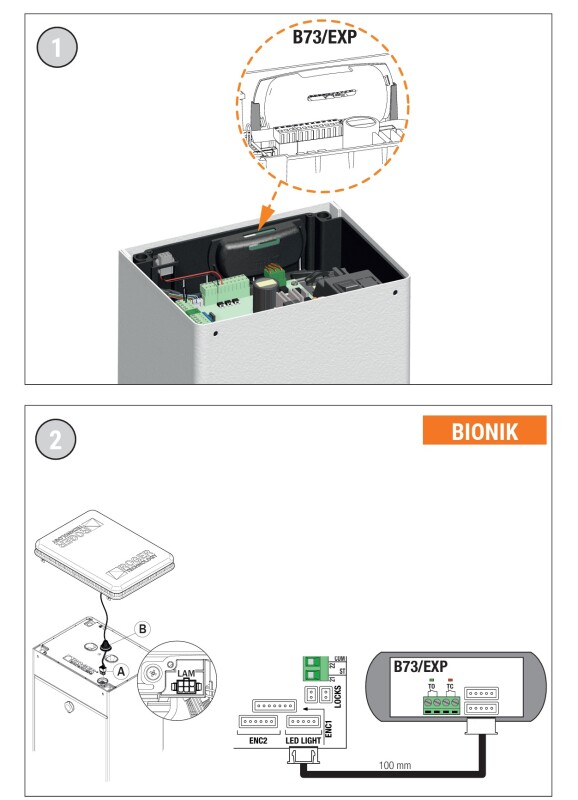 Коли стріла повністю відкрита, розмикається контакт TO (NC), і на платі B73/EXP загоряється зелений світлодіод.
