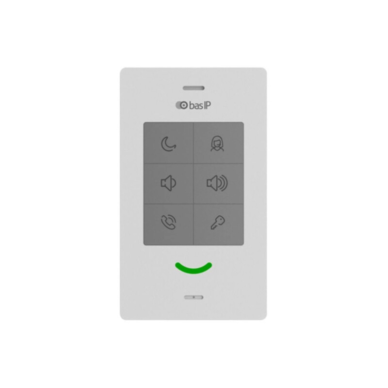 Абонентський IP аудіопристрій (аудіодомофон) Bas-IP SP-03F white сенсорними кнопками, з підтримкою Wi-Fi, SIP, P2P і внутрішнього протоколу BAS-IP. Оснащено кнопками для швидкого виклику консьєржа, відмикання замка, керування режимом «Не турбувати», електронного регулювання гучності, а також для виклику ліфта на поверх.