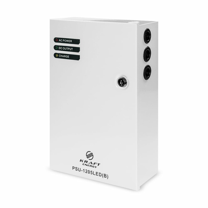 Блок безперебійного живлення імпульсний Kraft PSU-1205LED(B) з LED-індикацією, у металевому боксі з місцем під акумуляторну батарею 18 Аг, номінальні вихідна напруга/струм 12 В/ 5 А, вхідна напруга 190-265 В.