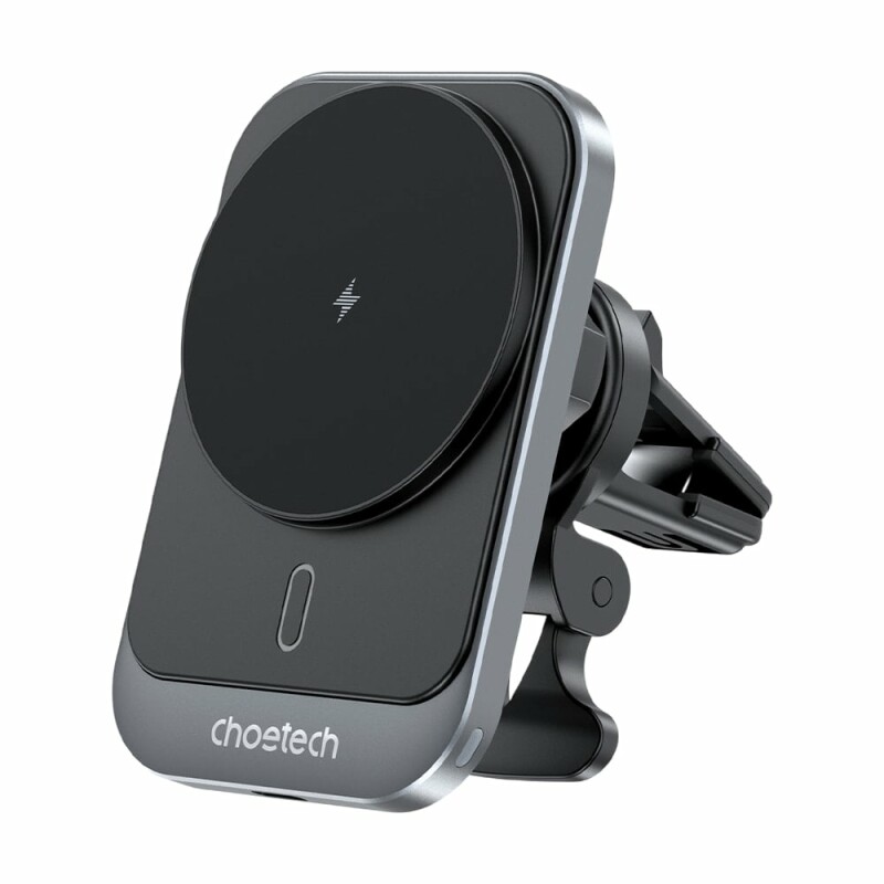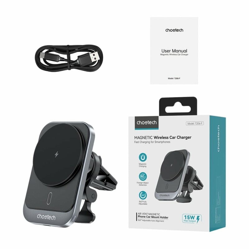 Автомобільний зарядний пристрій Choetech T206-F Black із магнітним тримачем для телефону, для встановлення на вентиляційну решітку. Максимальна вихідна потужність 15 Вт. Підтримка бездротового заряджання за стандартом Qi, сумісність із пристроями від Apple, LG, Samsung, Google та інших виробників, вхідний порт USB Type-C 5 В/2 А, 9 В/2А з підтримкою швидкого заряджання QC3.0/PD.