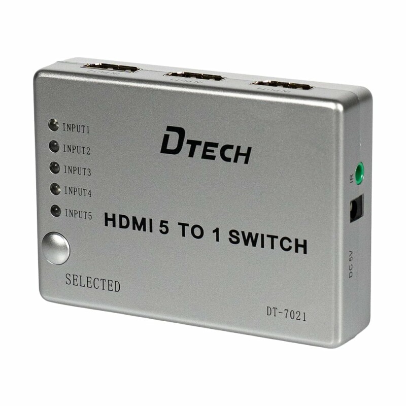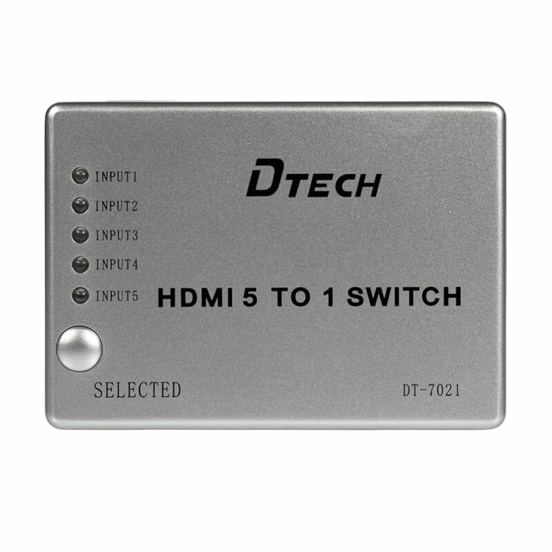Комутатор HDMI Dtech DT-7021 (MS) з 5 вхідними портами HDMI та 1 вихідним портом HDMI, підтримує перемикання між кількома джерелами HDMI-сигналу та дозволяє передавати відео високої роздільної здатності (4K) та цифрове аудіо. Підтримує дистанційне керування через інфрачервоний пульт (у комплекті). Живлення від адаптеру з комплекту 5 В/1 А.