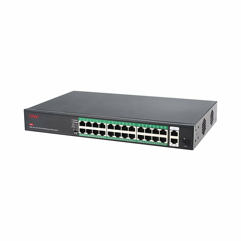 Комутатор PоE ONV-H1024PFD оснащений 24 портами PoE 10/100M, 2 портами Uplink 10/100/1000M, а також портом SFP 1000M. Стандарт живлення PoE IEEE802.3af/at. Загальна потужність 250 Вт, 30 Вт на 1 канал. Відстань PoE: до 100 м (100 Мбіт/канал), до 250 м (10 Mбіт/канал) для портів 17-24.