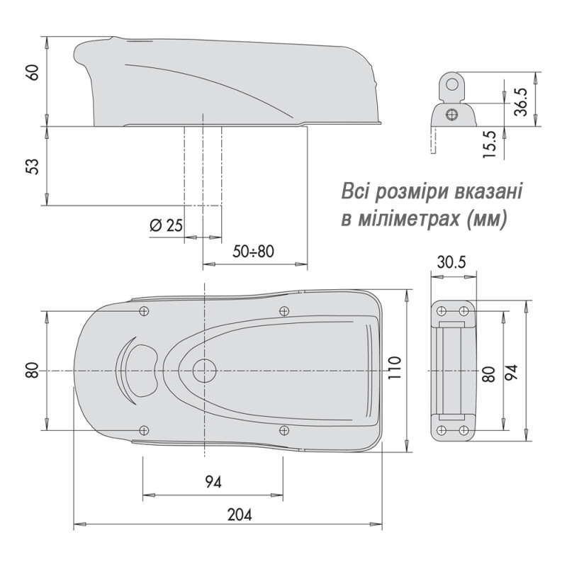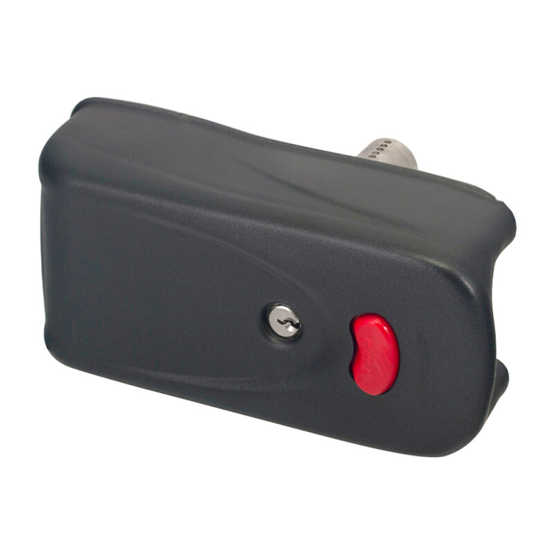 Відмикається імпульсом електричного струму (12V), а також ключем або за допомогою вбудованої механічної кнопки. У комплекті додається 3 ключи.