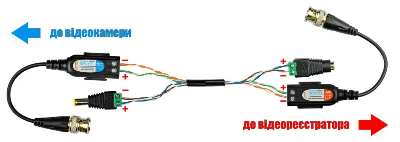 Підключення камер до відеореєстратораДля під'єднання камер SEVEN до відеореєстратора в комплекті передбачено кабель кручена пара з розрахунку 20 м на кожну камеру та комплекти роз'ємів живлення і спеціальних прийомопередавачів. Для зручності користувач може самостійно визначати довжину кожного кабелю для під'єднання відеокамери з огляду на особливості його об'єкта. На кабелі з боку відеокамери монтується прийомопередавач і роз'єм живлення "тато", а з боку відеореєстратора - прийомопередавач і роз'єм живлення "мама". За допомогою такого кабелю до відеокамери під'єднують BNC роз'єм прийомопередавача для передавання відео та конектор живлення "тато" для подачі на камеру живлення 12В. Другий кінець кабелю під'єднується роз'ємом BNC до відеореєстратора і роз'ємом живлення "мама" до блоку живлення. Досить просто під'єднати камеру до живлення і відеореєстратора, після чого він визначить камеру і покаже з неї зображення.