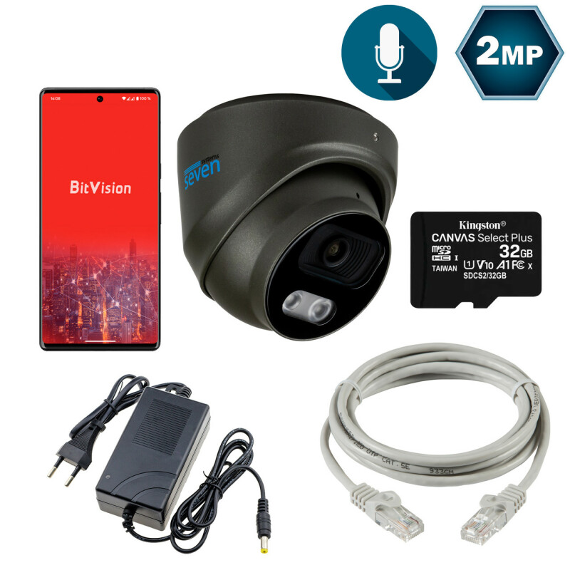 SEVEN IP-7212PA black - це купольна 2-х мегапіксельна IP-відеокамера з вбудованим мікрофоном, слотом під MicroSD-карту і адаптивним інфрачервоним підсвічуванням. Камера виконана в повністю металевому антивандальному корпусі чорного кольору і захищена від вологи за стандартом IP67. Відеокамеру можна встановлювати на вулиці або всередині приміщення. Установка і підключення камери безпеки до комп'ютера, відеореєстратора, роутера, світчу проводиться по кручений парі.